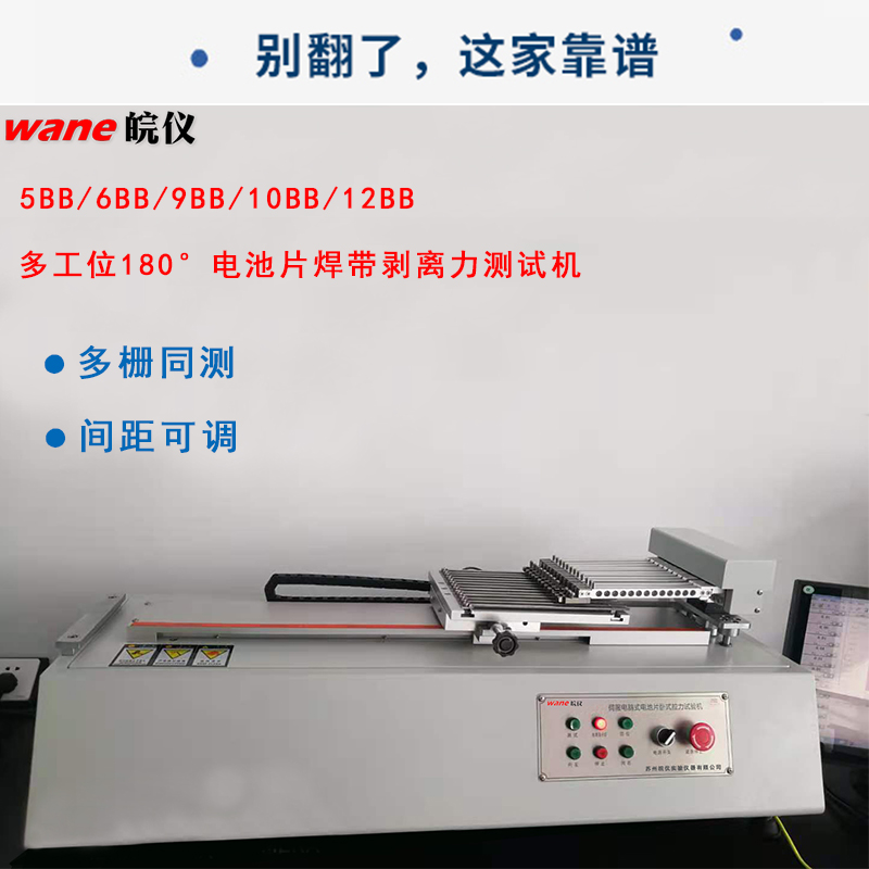 12BB電池片焊帶剝離強(qiáng)度試驗(yàn)機(jī)兼容3BB/5BB/6BB/9BB/10BB/12BB電池片多工位多通道,兼容156mm/158.75mm/166mm/210mm/230mm等不同尺寸電池片,MBB電池片專用測試夾具可根據(jù)不同柵線間距,夾具可調(diào),操作簡便,省時、省力。多柵同時測試,夾具端移動,傳感器測試過程中靜止不動,更好的保證測試精度。